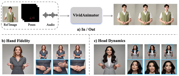 Existing for audio- and pose-driven human animation methods often struggle with stiff head movements and blurry hands, primarily due to the weak correlation between audio and head movements and the structural complexity of hands. To address these issues, we propose extbf{VividAnimator}, an end-to-end framework for generating high-quality, half-body human animations driven by audio and sparse hand pose conditions. Our framework introduces three key innovations. First, to overcome the instability and high cost of online codebook training, we pre-train a Hand Clarity Codebook (HCC) that encodes rich, high-fidelity hand texture priors, significantly mitigating hand degradation. Second, we design a Dual-Stream Audio-Aware Module (DSAA) to model lip synchronization and natural head pose dynamics separately while enabling interaction. Third, we introduce a Pose Calibration Trick (PCT) that refines and aligns pose conditions by relaxing rigid constraints, ensuring smooth and natural gesture transitions. Extensive experiments demonstrate that Vivid Animator achieves state-of-the-art performance, producing videos with superior hand detail, gesture realism, and identity consistency, validated by both quantitative metrics and qualitative evaluations.
